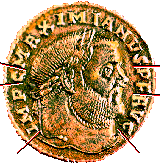 Now look at the image on the right to see how this title actually breaks down into its components.The first 3 characters are 'IMP' which is easy enough to find and stands for Imperator. The fourth character 'C' is very often found with 'IMP' and can be seen is the abbreviation for Caesar. The 5th through 14th characters are not listed in the list, so we will put it aside for now and come back to them later. The 15th and 16th characters 'PF' can be found in the list as can the 17th through the 19th which are 'AVG'. Now it is time to go back to the unknown letters, the 5th through the 14th. We already know the 'MAXIMIANUS' does not appear in the titles list. So now what? Now we go take a look at the Roman Names As They Appear On Coins. To do a fast check, click on the 'M' to take you directly to the part of the list with MAXIMIANUS. That helps some. We have narrowed the list of possible emperors to two; Galerius and Maximianus. If you have a reference on Roman coins available, take a look at the portraiture that is typical of both emperors. By comparing you will see that the portrait is typical of that for Maximianus. So now we have the title and the actual name of the emperor. Putting it all together (with the proper spacing), we have; 'IMP. C. MAXIMIANVS P.F. AVG.' The full translation of the title reads: 'Imperator Caesar Maximianus Pius Felix Augustus'. Thats all there is to it. Find one of your own coins, write down the title and try running it through the same steps. With a little practice you will become comfortable with attributing your own coins. You may be surprised at what you may find.